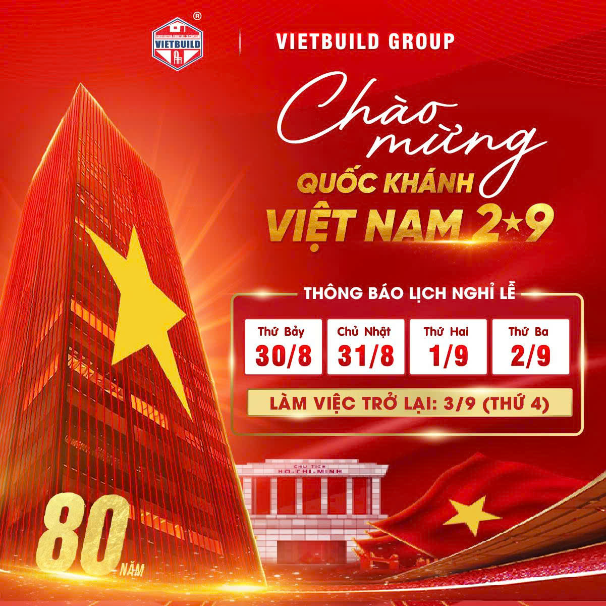 Nhân dịp 80 năm Quốc khánh nước Cộng hòa Xã hội Chủ nghĩa Việt Nam (2/9/1945 – 2/9/2025), Vietbuild Group trân trọng thông báo lịch nghỉ lễ như sau: